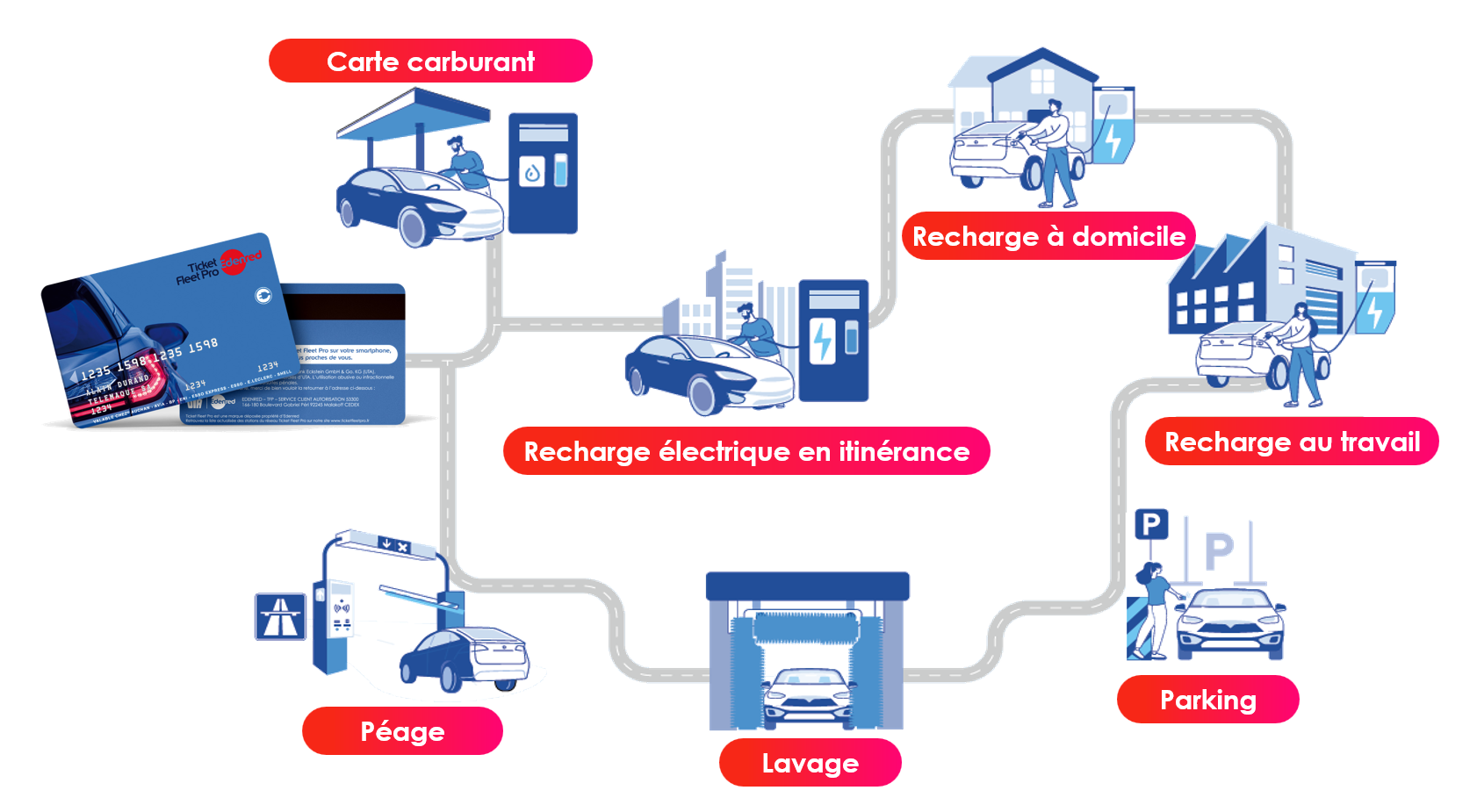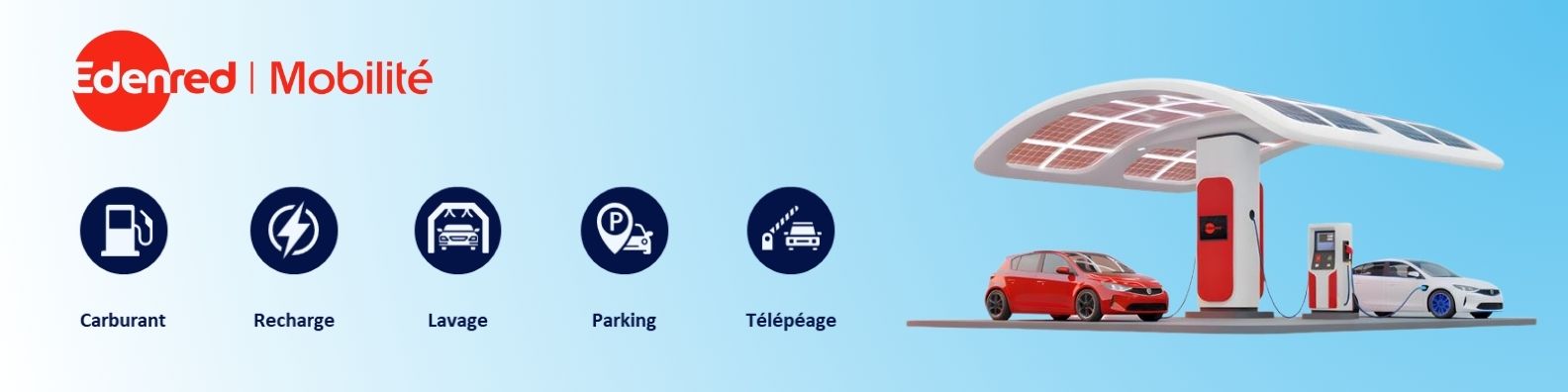 Edenred Mobilité accompagne les entreprises dans la gestion et la décarbonation de leurs flottes. Sa mission : rendre la transition énergétique simple et opérationnelle quel que soit le type d’énergie utilisée. Ses solutions couvrent: cartes carburant et multi‑énergies Ticket Fleet Pro (+ de 5600 stations, + de 97% des bornes), péage, parking, maintenance et installation de bornes en entreprise ou à domicile