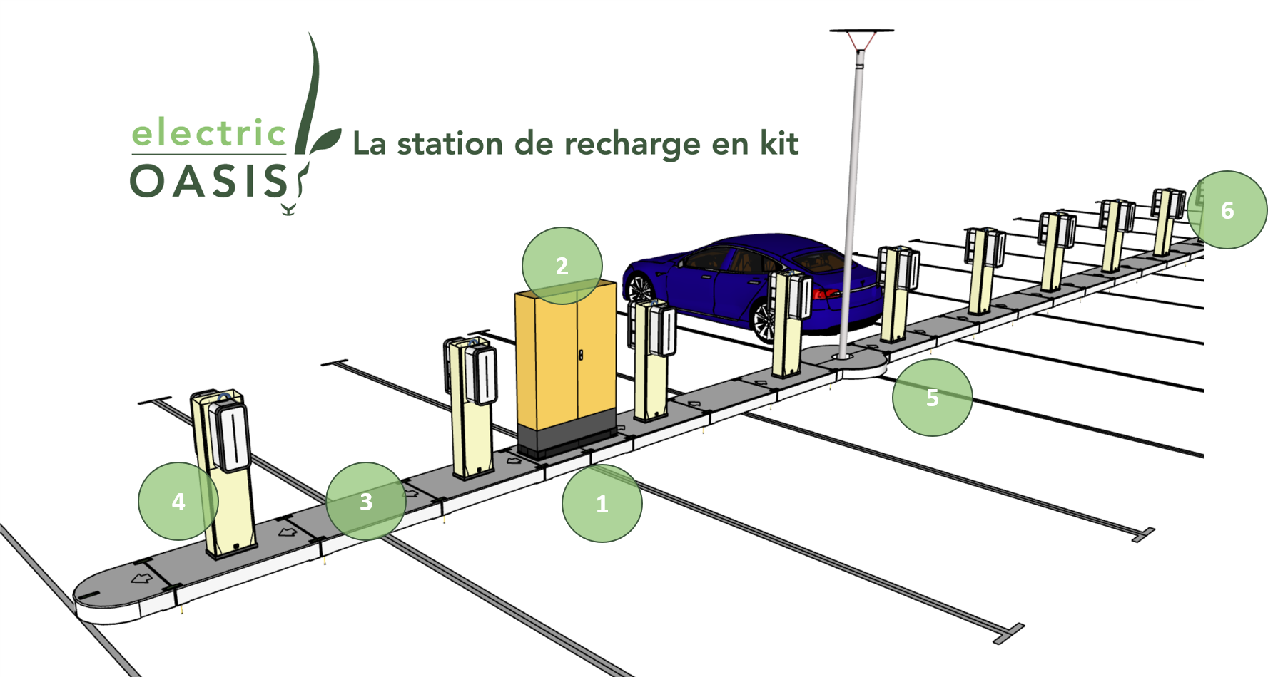 Electric Oasis propose aux entreprises ayant des parkings extérieurs une infrastructure de recharge offrant: - Rapidité et Facilité de pose sans génie civil - Flexibilité en étant nativement adaptable aux besoins futurs - Pérennité en protégeant durablement les investissements de l'infrastructure électrique amont.